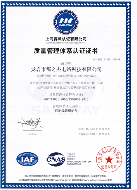 自1997年成立以來,都之杰已經(jīng)獲得ROHS產(chǎn)品認證,各項技術指標達到國家先進水平,質量和信譽是企業(yè)的生命,我們一直以來持續(xù)不斷改善產(chǎn)品的質量,以質量取勝市場,提高公司的信譽度。多年來憑優(yōu)良的產(chǎn)品質量、準時快捷的供貨和周到細致的服務,深得國內外客戶的好評。我們已經(jīng)獲得良好的聲譽和客戶的信任,并逐漸成為客戶可信賴的、能長期合作的印刷線路板戰(zhàn)略合作供應商。我們堅持向國內外先進企業(yè)學習并不斷提升自主創(chuàng)新。公司擁有經(jīng)驗豐富及穩(wěn)定的團隊,視質量為企業(yè)生命,嚴格推行ISO9001質量管理體系,符合ROHS標準,并獲得了UL安全認證、TS16949和CQC認證。
